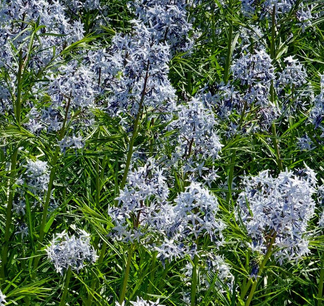 Als er ergens een Amsonia bloeit wordt er steevast naar gevraagd, dat mist nooit. “Wat is dat voor een plant?” Amsonia wordt steeds bekender, gelukkig. Ze zijn het waard. Sterke, vaste planten die bloeien met ontelbare blauwe sterretjes. Deze Amsonia hubrichtii heeft smal, bijna naaldvormig blad en bloeit lichtblauw. De verkleuring in de herfst is prachtig. Ineens staat er een goudgele bos in de tuin. Verdraagt zon en halfschaduw. Toepasbaar op veel plekken.