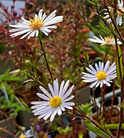 Over deze Aster kan ik niet veel vinden behalve een bericht van Coen Jansen dat het een zaailing is van Chilly Fingers.  Frozen Fingers heeft in ieder geval een koele kleur, dat gaf de naam al weg. Wittig lila. Vrij bossig en veel bloemen. Fijn voor bijen en vlinders die zo in de nazomer en herfst ook nog genoeg voedsel kunnen vinden.